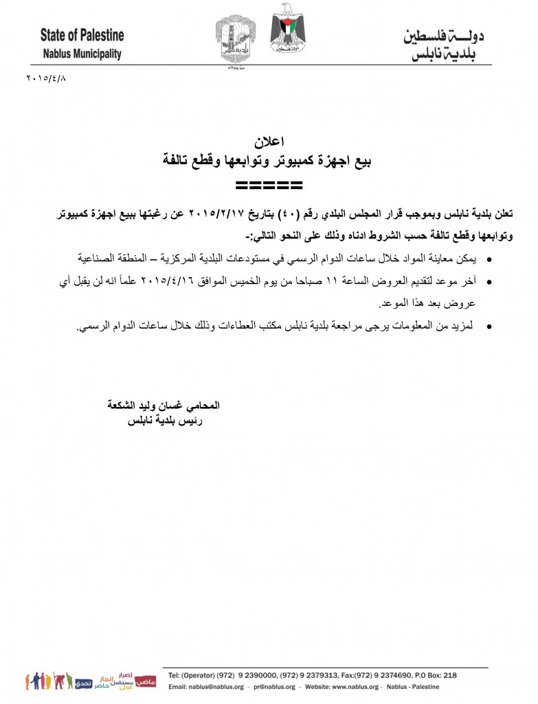 اعلان بيع اجهزة الكمبيوتر وتوابعها القديمة الموجودة في مستودعات البلدية