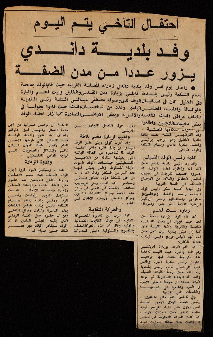 شهد العام 1982 توقيع أول اتفاقية توأمة لمدينة نابلس، في عهد رئيس بلدية نابلس الأسبق المرحوم بسام الشكعة ضمن ما يعرف بالموجة الأولى لبدلوماسية المدن الفلسطينية. وقد وقعت هذه الاتفاقية مع مدينة دندي الاسكتلندية.